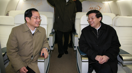 金壯龍總經理與李偉副主任在ARJ21-700飛機樣機里親切交談。