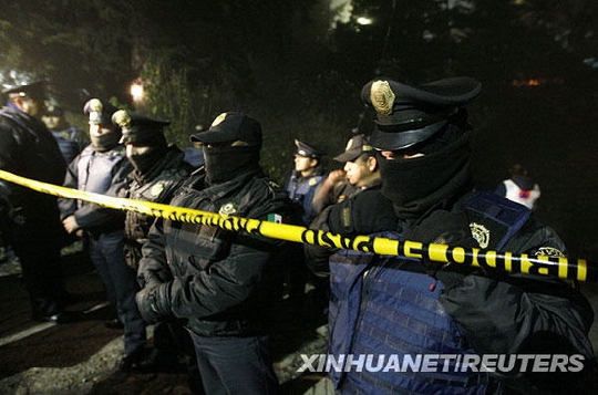 圖7:2010年1月10日,在墨西哥首都墨西哥城,警察在直升機墜毀現場警戒。當晚,一架直升機在這里墜毀,造成3人死亡。新華社/路透