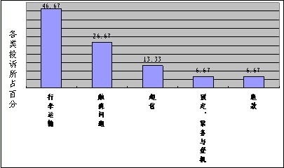 一、對航空公司的投訴情況 1、國內航空公司投訴類型及比例 本月受理消費者對國內航空公司的投訴101件,有效投訴15件。其中,行李運輸7件,占46.67%;航班問題4件,占26.67%;超售2件,占13.33%;預定、票務與登機1件,占6.67%。、退款1件,占6.67%。 2、國內航空公司的投訴率統(tǒng)計 本月25家航空公司中有6家航空公司發(fā)生了有效投訴,航空公司平均投訴率為萬分之零點零零七。 二、對機場的投訴情況 本月對機場的投訴15件,有效投訴2件。 三、對航空運輸銷售代理企業(yè)的投訴情況 本月對航空運輸銷售代理企業(yè)的投訴9件,有效投訴5件。
