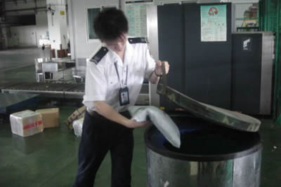 5月5日,南航深圳公司安檢站成功舉行了一次疑似爆炸物演練活動。上午9時30分左右,開機員李洋在2號X光機執行貨物檢查任務。突然,一票貨物的X光機圖像使他立刻緊張起來,對圖像進行進一步分析判斷后,李洋確定該貨物為疑似爆炸物。于是,他立即對X光機進行停機處理,并迅速通過對講系統將情況報告值班中隊長。接到值班分隊長的指令后,李洋立即啟動了緊急事件處置程序。只見他以迅雷不及掩耳之勢將疑似爆炸物投入防爆罐,然后迅速將周圍的工作人員疏散到安全范圍之外,一系列工作緊張有序、忙而不亂。