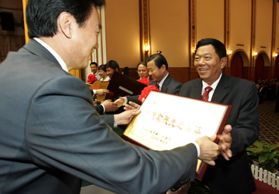 中國民航新聞信息網 通訊員凌興東、王有勉報道:5月13日,大連市政府在棒槌島國賓館集會,隆重表彰扶殘助殘先進集體和個人,南航大連分公司被大連市委、市政府授予扶殘助殘先進集體稱號。圖為大連市委書記夏德仁向南航大連分公司總經理楊建新頒發獎狀。