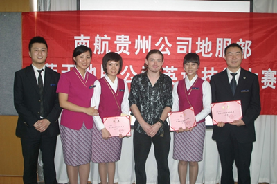 中國民航新聞信息網 通訊員趙梁報道:為配合南航戰略轉型,使地服人員外語能力與國際化服務需要接軌,近日南航貴州公司地服與貴陽機場地服聯合舉辦了首屆英語技能大賽。貴州公司總經理馮華南、黨委書記趙鐵軍、副總經理涂昆、南航地服部領導江平及機場地服公司總經理竇衛中、黨支部書記劉丹等親臨現場觀看了比賽,比賽還特別邀請了外教JOHN,以及機場和公司的專業人士擔當評委。
