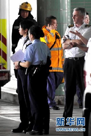 圖3:2010年7月3日中午,獲救的機組人員(前右一,光腳者)和救援人員在一起。當日中午12時左右,一架直升機在香港島上環附近海域落海,包括機組人員在內的13人被全部救起。攝影:記者黃曉勇/新華社