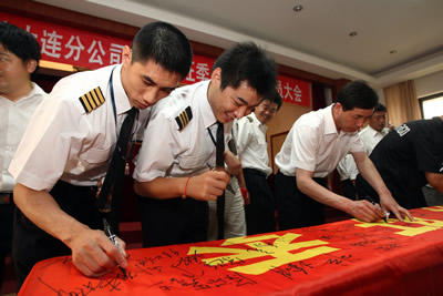會后,所有參會人員在“決戰旺季”的大條幅上精心了誓師簽名,表達了決勝忘記的信心和決心。圖為飛行人員在條幅上簽名。