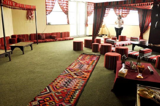 圖2:訓練飛機模型。 圖3:這是777-300模型,進行安全訓練的地方,可以模仿飛機遇到各種氣流的情況,并訓練指導乘客逃生。 圖4:這就是著名的大飛機A380,模仿水上逃生。 圖5:正好趕上里面在上課,聽到一陣陣驚恐的逃難聲。。。模仿者有些就是平日的人力資源或者行政的同事,他們有的假裝成毫無經驗的客人,有的假裝成非常不配合的客人,“刁難”學員們。 圖6:教空乘體態儀表的黑人女老師。 圖7:空姐空少們學化妝的地方,阿航沒有指定的化妝品品牌,只是對口紅的顏色有嚴格的要求,必須非常非常紅,如果不紅輕則警告,重則罰款。 圖8:這是健身房,主要在這里學習如何使用這些器械,而他們在世界上很多酒店健身房,都有協議進行免費練習。 圖9:他們在學習擒拿,這個很有意思,因為擒拿靠的完全是技術,力量只是輔助的。據說一個空姐能制服一個喝醉的彪形大漢呢。 圖10:這個地方教的是如何在飛機上賣免稅商品,據說一個飛機上有2個人可以去賣免稅商品,而他們是有提成的。但是由誰賣,要乘務長定。每個空姐都希望幸運在自己頭上,尤其飛非洲航線的。 圖11:這是讓新空乘們學習阿拉伯社交的場所,讓他們理解阿拉伯社交文化。 圖12:他們喝當地的咖啡,很酸很澀。 圖13:這是空中醫療急救用的工具。