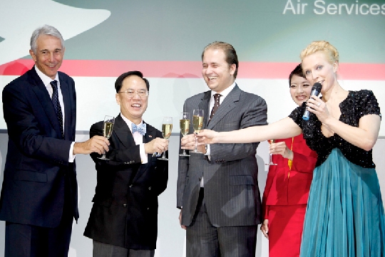香港國泰航空有限公司(Cathay Pacific Airways Limited,簡稱“國泰航空”)于9月1日在俄羅斯首都莫斯科舉行盛大晚宴,慶祝每周三班來往香港至莫斯科的客運(yùn)服務(wù)啟航。出席的300多位賓客冠蓋云集,包括香港與俄羅斯兩地的政府官員、航空官員及商界領(lǐng)袖。 晚宴由國泰航空行政總裁湯彥麟主持,并由香港特別行政區(qū)行政長官曾蔭權(quán)及俄羅斯-香港商會主席Ivan Polyakov主禮。30多位香港商貿(mào)代表也專程前往莫斯科,出席此次慶典。 香港特別行政區(qū)行政長官曾蔭權(quán)在晚宴上致辭時表示:“新直航服務(wù)推出的時機(jī)實在最理想不過。自去年俄羅斯與香港實施兩地互免簽證措施以來,來往兩地的旅游人數(shù)大幅增加,而今年上半年,我們的經(jīng)濟(jì)環(huán)境亦已從金融危機(jī)中顯著復(fù)蘇。今年頭六個月,俄羅斯與香港的雙邊貿(mào)易,相較去年同期增長逾倍。” 圖2:主禮嘉賓在晚宴上舉杯慶祝國泰航空開辦每周三班來往香港與莫斯科的直航班機(jī)服務(wù)。左起:國泰航空行政總裁湯彥麟、香港特別行政區(qū)行政長官曾蔭權(quán)及俄羅斯-香港商會主席Ivan Polyakov主禮。 “莫斯科直航服務(wù)的推出,將為香港與俄羅斯的貿(mào)易和旅游業(yè)注入更強(qiáng)大的動力,促使兩地的經(jīng)貿(mào)合作更形緊密。” 國泰航空行政總裁湯彥麟說:“俄羅斯市場潛力雄厚,國泰航空多年來一直致力尋求進(jìn)入這個市場的機(jī)遇。我謹(jǐn)在此感謝香港與俄羅斯政府的鼎力協(xié)助,讓我們順利開辦來往莫斯科的航班服務(wù)。” 慶祝晚宴上安排了精彩的表演節(jié)目助興,包括俄羅斯傳統(tǒng)芭蕾舞蹈和音樂演出,以及國泰航空獨(dú)家制作的“飛躍云裳”時裝展覽,由國泰航空機(jī)艙服務(wù)員親自上臺演出,為座上賓客展示國泰的發(fā)展歷程,以及歷代機(jī)艙服務(wù)員制服的演變。 莫斯科是國泰航空今年增加的第2個歐洲航點,航班服務(wù)已于7月13日正式啟航。連同3月28日推出的每周四班來往意大利米蘭的航班服務(wù),國泰航空的環(huán)球客運(yùn)航點數(shù)目現(xiàn)已增至48個。