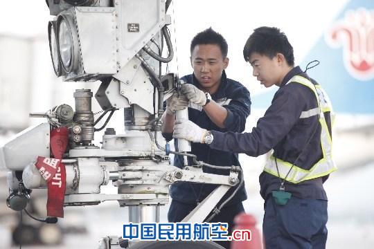 飛機在烏魯木齊停留一個半小時后繼續飛往北京,機務人員在航前認真細致檢查飛機狀況。攝影:任春山