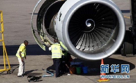 圖2:10月11日,在烏干達的恩德培機場,技師檢查發生故障飛機的引擎。