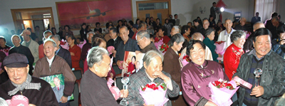 相約金婚 喜慶的笑臉,彩色的衣裝,紅色的背景幕布,"最美不過夕陽紅"的溫暖歌聲,73對金婚夫婦的合影在大屏幕上一一播出。女士或著白色婚紗、或著紅色唐裝,男士則是筆挺的西服、燕尾服,他們雖然已是滿臉皺紋、白發蒼蒼,可是溫馨、從容、自豪、淡定卻寫在每個人的臉上。他們或是互相挽著手,或是輕輕搭著肩,或是淡淡相擁著,傳達出的對愛情的執著、包容、體諒,卻足以讓在場的觀眾唏噓感動。五十年的風雨同舟,五十年的相濡以沫,他們的腰板已不再硬朗,腳步已稍顯蹣跚,可此時生命賦予的意義和內涵卻愈發閃現出了金色的光芒。 山西分公司目前有離退休人員366名,其中有很多都是共同為祖國的民航事業奮斗一生的伉儷,他們將自己青春、汗水奉獻給了藍天,有的甚至為新中國的成立拼過命、流過血。嘔心瀝血、不屈不撓、頑強拼搏,正是他們的努力為我們今天的再發展打下了堅實的基礎,他們的經驗和智慧是黨和國家、更是東航的寶貴財富。相約在這個美好的節日,為他們舉辦一次隆重的慶典,不僅是對生活的美好引領,更是分公司黨委對離退休人員的惦念和祝福。 金色祝福 "退下來的老同志退而不休,在政治上依然關心國家大事,思想上關心東航的效益和發展,生活上自食其力,學習作風方面仍然是我們學習的榜樣……",分公司黨委書記高峰代表分公司領導和黨委向廣大老職工及家屬們致以節日的問候和敬意。高書記向大家通報了目前東航良好的經營形勢和山西分公司的生產經營情況,他的講話令每一位在場的老干部深感欣慰。高書記祝福大家,當得夕陽無限好,何必惆悵近黃昏,不必在意歲月流逝的太快,不必抱怨生命的短暫,關鍵是要活出質量,真誠希望我們的老同志生活的恬靜、安逸、幸福,天天充實,時時精彩!他熱情洋溢、充滿感情的演講令現場響起雷動的掌聲。 分公司專門為金婚夫婦準備的水晶婚紗照和金婚紀念杯,伴著領導的一聲聲祝福問候、一句句親切關懷,送到了每對夫婦手中,時光也仿佛穿越了時空回到了曾經的歲月。那是她年輕漂亮,他英俊瀟灑,他們信步牽手走進婚姻的殿堂;而今她容顏已老,他腳步蹣跚,可是這個金色的秋天卻結出了串串金色的果實。當水晶紀念杯拿在手中時候,拿起的不僅僅是五十年的風雨,更是分公司對他們祖國民航事業做出貢獻的沉甸甸的感恩和認可。 金色風采 1985年就獲得全國五一勞動獎章的老干部顧振藩,在回憶起自己曾經的生活時感慨萬千。那時他和老伴分居兩地,就連過年過節也難得團聚,他從事航空拍攝任務,而老伴的工作是把照片沖洗出來,所以每次老伴只能從別人帶回的照片里知道他的行蹤,就是這樣,那份甜蜜和溫暖依然讓相隔千里的兩個人感到彼此的牽掛和依戀。顧振藩老人在說到兩個孩子的出生時,他都因為出差在外沒有盡到責任,眼里滿是對老伴的愧疚,他說,不過不光是我們,那時大家都是這么過來的,所以年輕人更應該珍惜現在的幸福生活。 舞臺上,同是五一勞動獎章獲得者的蔣秀玲正在翩然起舞,他的老伴用吉它為她伴奏,他們夫妻共同創作的歌曲悠然響起,"我記得你最愛穿得那條白裙子,我記得你說最愛看我傻傻的笑,我們一起攢錢買房子,我們抱著胖兒子,如今我們一起坐在老院子,回憶我們的苦日子,我已長出白胡子,可你依然是我的小娘子……"歌聲、舞姿和兩個人臉上幸福的笑容,不管是老同志,還是年輕人都被他們深深感動。專程從北京趕來參加活動的原華北局局長孟魁梧在看完他們的演出后也感慨地說:"我為大家感動,更為你們喝彩,你們詮釋著真愛的偉大和生命的真諦,感恩父母、感恩大自然、感恩時代、感恩陪我們一起走過的人,在真愛中獲取智慧、希望和幸福。" 在會場溫暖悠揚的歌聲中,在老同志精神矍鑠的舞蹈中,在新朋老友相互的祝福聲中,在每個人眼里閃動的淚光中,東航山西分公司金婚慶典活動徐徐拉上了幕布,老同志、老干部身上的對家庭、對人生、對事業執著追求一生的力量和信念,卻如溪水般灌溉進每個人的心田……(圖:楊慧明、賴琦、陳平士)
