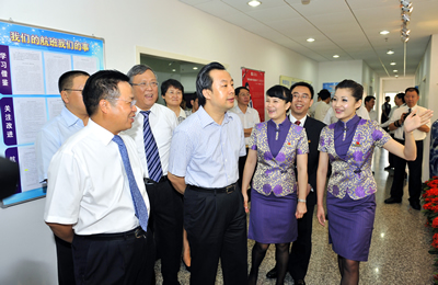 陸昊書記一行與廈航領導以及飛行員和乘務員親切合影。賀晟攝 本次會議在國家級"青年文明號"先進單位廈航乘務部舉行,廈航黨委書記洪荻生代表廈航作工作匯報,廈航總經理車尚輪、黨委副書記尤祥輝以及公司團干參加了會議。會上,陸昊書記對廈航"青年文明號"的創建工作進行深入了解,對廈航的黨建帶團建創先爭優工作成績給予肯定,陸昊書記稱贊:廈航是"青年文明號"的典型和創先爭優工作標桿單位。 陸昊書記高度肯定廈航乘務部團隊文化墻_賀晟攝 廈航黨委書記洪荻生表示:團中央和省市領導對廈航的關心、支持和厚愛,使廈航倍受鼓舞、倍感振奮,使廈航增強了進一步做好黨建帶團建工作,深化創先爭優活動、推動廈航科學發展的信心和決心。 獨具特色企業文化受贊譽 陸昊書記在調研座談會前,首先對廈航乘務部進行視察,廈航的員工昂揚向上的精神風貌、全面系統的團隊文化建設以及嚴格規范的管理理念和以人為本的青年培養方法受到陸書記的肯定。 廈航乘務員為陸昊書記介紹乘務部嚴格規范的管理理念和全面系統的團隊文化建設。賀晟攝 當陸書記一行來到廈航乘務部時,乘務員靚麗優雅的儀態、親切溫和的微笑給陸書記留下深刻印象。隨后,乘務部一樓大廳由上千名乘務員微笑形象組成的微笑墻、乘務隊創先爭優宣傳板報、乘務部團隊文化墻的團隊作風、管理理念、安全理念、服務理念、企業精神以及具有廈航乘務部特色的溝通室等引起陸書記的關注。 陸昊書記指出:微笑是一種發自內心的真誠,只有尊重、理解自己的工作,才會有發自內心的微笑,這也是對職業的熱愛,對職業的尊敬。廈航能夠把"青年文明號"創建的要求和職業文明具體地轉變為崗位規范和職業精神,同時在注重隊伍整體發展的過程中,不忘尊重和理解青年人的合理訴求和心理意識發展,這種把企業發展和對員工的人文關懷有機結合的做法值得推廣。隨后,得知今年廈航派駐優秀空姐在上海世博會進行長達5個月的禮儀服務時,陸昊書記再次予以肯定:"青年文明號"以你們為驕傲! 陸昊書記對黨建帶團建暨共青團創先爭優工作提出指導性意見和要求。賀晟攝 有聲有色黨團建設引關注 調研會上,廈航黨委書記洪荻生首先從企業組織架構、人員組成、發展成績以及黨團員發展情況作了簡要介紹,隨后從注重圍繞企業生產經營開展黨建團建工作,注重社會主義核心價值觀教育、團隊精神培育,注重從團員青年中發展黨員、培養骨干,注重人文關懷和心理疏導,注重典型引路,努力增創先進等六個"注重"方面介紹了廈航的黨建帶團工作以及爭先創優活動。洪書記表示,廈航是一個較為年輕并不斷發展中的企業,有一支年輕富有朝氣的職工團隊,目前共有在編職工7610人,35歲以下青年5260人,占總人數的69%。職工平均年齡31.8歲,黨團員占了總人數的67.4%,在2302名黨員中,35歲以下黨員占1201人(占52%),團員2825人。廈航的主要生產運行崗位都是以年輕職工為主力,其中飛行員805人,乘務員1100人,機務人員1262人。廈航的青年職工比重大,黨團員比重大的特點,使我們認識到只要把黨團隊伍建設好,作用發揮好,廈航的健康持續發展就有了根本保證。廈航團委副書記王濤介紹了廈航各級黨團組織從思想引領、組織建設、事業凝聚、服務青年四個重要平臺帶動廣大團員青年創先爭優工作的開展情況。 廈航在黨建團建方面的經驗和做法引起陸書記高度關注和重視。陸書記對廈航乘務隊"青年文明號"不僅自己先進,還帶動很多青年達到"青年文明號"先進的工作標準給予肯定。得知廈航擁有自己的網絡交流平臺,甚至開通企業微博,進一步增強社會大眾與企業的溝通交流,搭建企業與員工非正式交流的重要渠道,關注到了與旅客、員工切身利益相關、和思想感受相關的具體問題,陸書記對這一做法表示贊賞。他指出,團組織建立非正式交流渠道有助于企業從員工當中獲取有價值的信息,有助于促進企業整體文化的形成,能夠增強企業內在凝聚力,能夠促進企業持續長久的發展。會上,陸書記也對廈航的黨建帶團工作點多面廣線長情況,以及如何加強青年員工思想意識塑造給予指導性意見。 黨建帶團創先爭優樹標桿 陸昊書記在總結講話中指出,廈航是共青團"青年文明號"創建的一個標桿單位,從廈航員工的精神面貌和神態上,能看出大家對在這個企業工作充滿自豪。廈航的黨建帶團工作也很好地把企業生產經營、青年員工的成長發展和共青團的和諧運作有機地結合了起來,在黨組織的帶領下取得了很重要的成績,對企業的發展做出了一定的貢獻。尤其是多年來,廈航乘務部大力倡導職業精神,教育廣大乘務員遵守崗位職業規劃、服務理念、管理標準,使之內生出一種追求、一種責任、一種意識,表現為外在的優質服務行為,進而為企業的發展和社會的整體進步做貢獻。 陸書記表示,聽取完匯報后更加堅信企業黨的組織可以在企業發展、企業生產經營上發揮重要的作用,企業共青團組織可以為企業的生產經營,為企業的發展,為青年員工的健康成長發揮重要的促進作用。希望各級共青團組織充分發揮積極性、主動性、創造性,配合好各級黨組織把團建工作扎扎實實做好,特別注意要把建團跟探索團組織活力發揮作用結合起來。 最后,陸書記著重對青年文明號如何進一步倡導職業精神,對企業團組織如何進一步