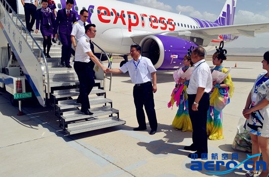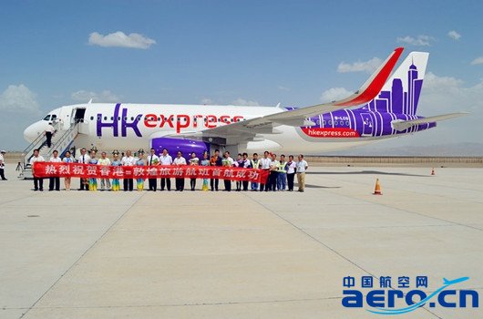 敦煌機場公司在國際聯檢廳門口舉行了隆重的首航儀式。蘭空司令部、省商務廳、省旅游局、省口岸管理辦公室、蘭州海關、甘肅省公安邊防總隊、甘肅出入境檢驗檢疫局、民航甘肅監管局、民航西北管理局、甘肅省民航機場集團等單位和部門領導14人,酒泉市、敦煌市政府領導,敦煌機場領導、敦煌市旅行社、新聞媒體記者共計100余人參加首航儀式。14:45,香港快運UO2380航班緩緩降落,145名香港旅客圓滿的完成了首航之旅。艙門開啟,四名身著敦煌飛天服裝的禮儀人員,各站兩列,歡迎香港嘉賓朋友的到來。機組人員下飛機后,甘肅省民航機場集團業務發展部總經理錢兵向機長和乘務長獻花,敦煌機場總經理韓祁、敦煌市旅游開發辦主任楊興蓉為機組其他人員贈送紀念品并互相握手問候。最后,全體出席接機儀式的領導及成員與機組人員合影留念,共同慶祝該航線首航成功。