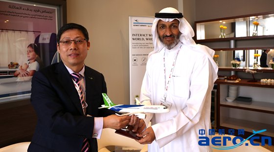 中國商飛公司市場部相關負責人向科威特航空首席執行官贈送C919飛機模型