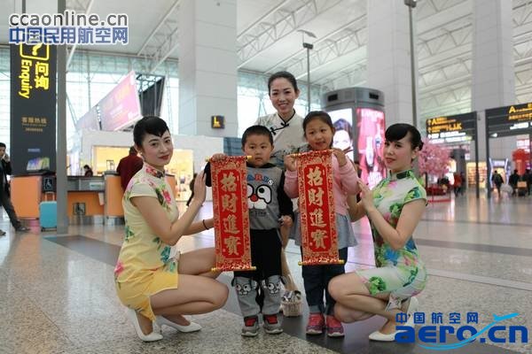 有了花燈,自然少不了燈謎和春聯。不過今年的謎面不是固定在花燈上,而是由“孫大圣”、“財神”等人氣卡通人偶現場派發。謎面和上聯圍繞機場、航空、網絡流行語句組成,旅客答對謎底或是對出下聯即可換取禮物一份。