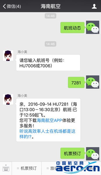 在線客服服務為旅客提供了方便快捷的咨詢服務,旅客可關注“海南航空”官方微信并回復希望了解的消息,如“航班動態”、“機票預訂”等,即可馬上收到實時消息(如附圖1)。