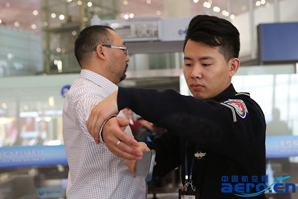 手檢員認真對旅客進行人身安全檢查