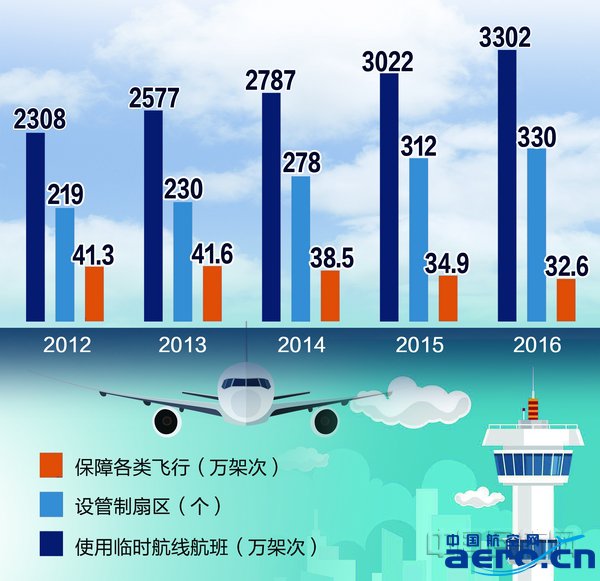 2016年,我國空管系統共保障各類飛行 3302萬架次;共設管制扇區 330個;使用臨時航線航班達到 32.6 萬架次,縮短飛行距離 979 萬公里、節省燃油消耗5.3 萬噸、減少二氧化碳排放 16.6 萬噸。截至 2016 年底,我國民航空管系統 7 個地區空管局的區域管制中心全部投入使用,空管系統建設成效顯著,5 年來保障各類飛行超過 1 億架次。