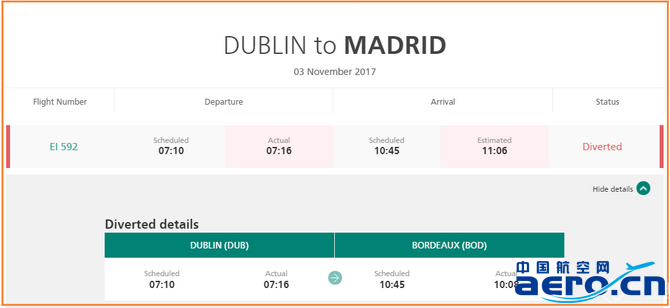 根據愛爾蘭航空發布的信息,該航班計劃時間10:45(北京時間17:45)備降波爾多機場,實際上提前于10:08分備降。
