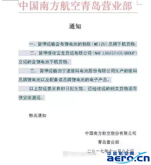 事故發生后,航空公司很快啟動了應急措施,魅族手機被明令禁運。據一則國貨航明傳電報截圖顯示,在國航/國貨航的航班之上,暫時停止運輸含有鋰電池的魅族系列手機產品貨物。同時被列入禁運名單的還有銷售代理公司寶龍貨運有限公司交運的鋰電池手機產品貨物和寧波維科電池股份有限公司生產的相關電子產品。并且在電報等級一欄赫然標注著“急件”。