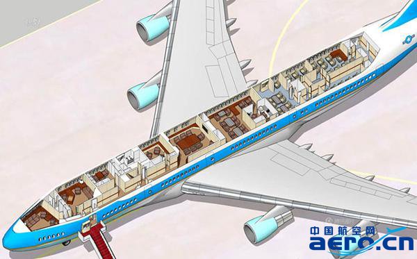 據“空軍一號”的制造商波音公司介紹,“空軍一號”由波音747改造而成,三層結構,室內空間面積約370平方米,擁有一間會議室、一個餐廳、一個總統套房、多間高級職員辦公室、一個可進行手術的醫療室(每次飛行均配備一名醫生)、一個媒體辦公區、兩個廚房(可為100人準備餐飲),以及先進的通信系統。