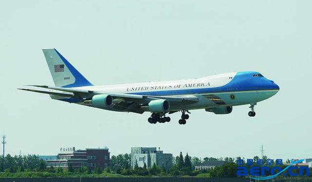 藍白相間的“空軍一號”是美國總統的豪華專機,機身印有“美利堅合眾國”字樣,機尾部分印著星條旗。