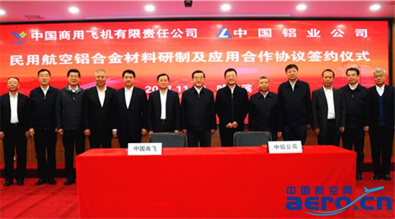 2017年11月20日,中國商飛公司與中國鋁業公司在黑龍江哈爾濱聯合舉辦航空鋁合金新材料技術交流活動,并簽署民用航空鋁材研制及應用合作協議。黑龍江省委書記、省人大常委會主任張慶偉,國家國防科技工業局副局長張克儉,工業和信息化部原材料工業司司長李巍,中國商飛公司黨委書記、董事長賀東風,中國鋁業公司黨委書記、董事長葛紅林出席活動。