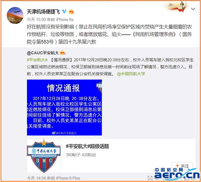 2017年12月28日晚上位于天津的中國民航大學校園內有人放煙花表白女生,有傳言稱導致鄰近的天津濱海國際機場航班延誤。12月29日下午,官方對此進行回應。