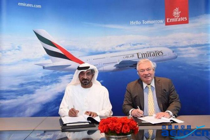 中國航空網訊:1月19日,總部位于迪拜的阿聯酋航空日前與空客簽署諒解備忘錄,承諾增購36架空客A380飛機。該筆訂單包括承諾訂購20架A380和另外16架飛機的選擇購買權,這批飛機將于2020年開始交付。以最新目錄價格計算,該筆訂單總價值為160億美元。阿聯酋航空集團董事長兼首席執行官謝赫·艾哈邁德·本·賽義德·阿勒馬克圖姆殿下與空中客車公司民用飛機客戶事務首席運營官雷義于18日上午在位于迪拜的阿聯酋航空總部簽署了這一協議。