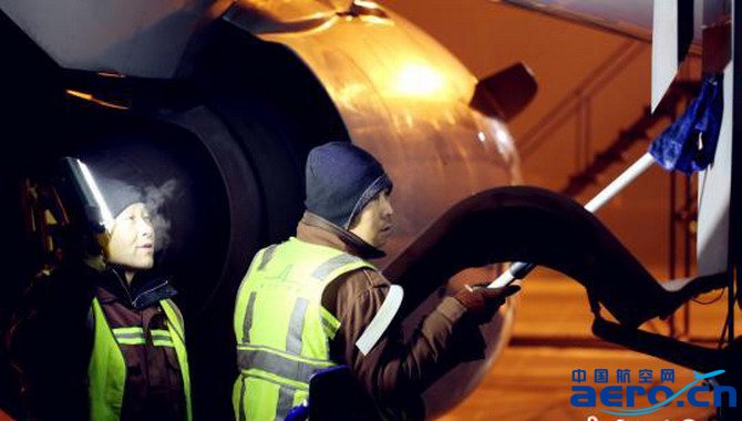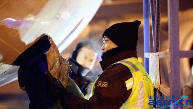 據記者了解,清洗工作一般是在航班飛行結束后從凌晨開始。由于碰到定檢旺季,機庫里的飛機已經裝不下了,清潔師只好在戶外給飛機“洗澡”,拿著工具擦洗著飛機的“肚子”。許東科說:“今年遇到極寒天氣,夜間氣溫非常低,戶外擦洗飛機需要邊擦邊烘干。”