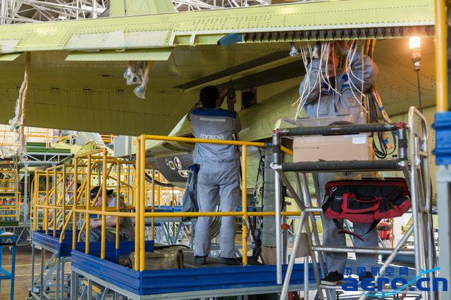 正在布線的員工,這架蘇-35前緣襟翼上已經安裝了相控陣敵我識別天線。