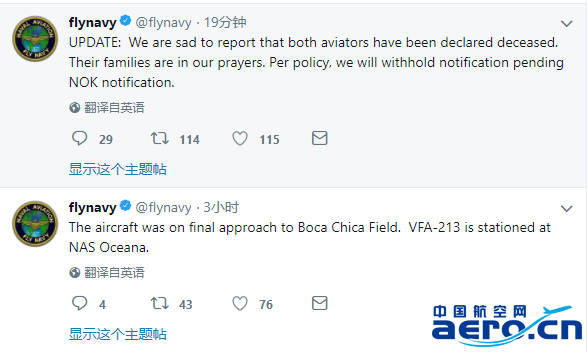 美海軍方面消息稱,F(xiàn)/A-18“超級大黃蜂”戰(zhàn)斗機當日下午4時30分左右墜毀,救援人員隨后在水中將機上兩名飛行員救出并送院治療。隨后,海軍航空兵方面發(fā)布推文表示:“更新: 我們很遺憾地報告, 兩名飛行員已被宣布死亡。他們的家人都在祈禱。”
