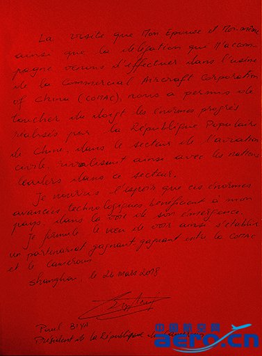 “透過中國商飛,我們可以感受到中國民機研制飛速發展的強勁脈搏,希望這些成果也能造福我的國家。”2018年3月24日,喀麥隆總統保羅·比亞(Paul Biya)到中國商飛公司訪問,欣然寫下這樣的贈言。