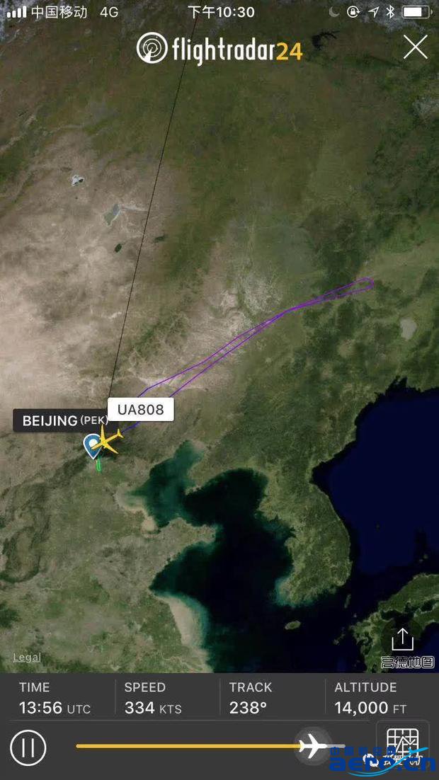 今晚一架美國聯合航空787-8(航班號UA808) 北京-華盛頓的航班,起飛兩小時后,應答機編碼掛7700,并決定返航。