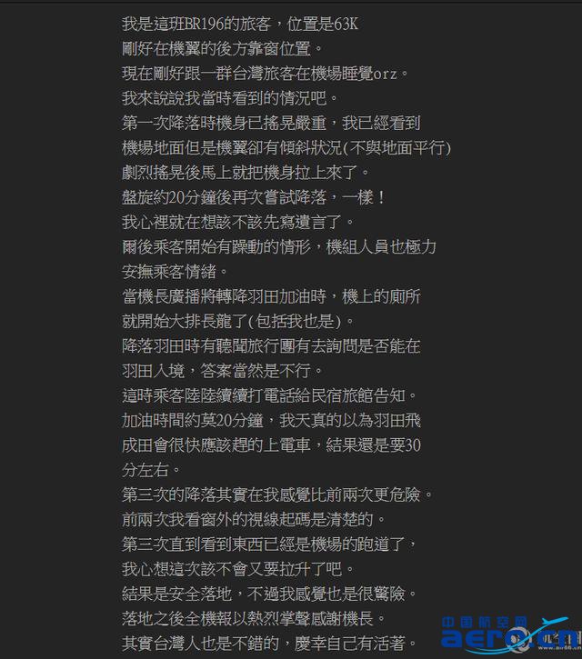 機上一名坐在63K位置的乘客發文介紹了當時的驚險情形。他說,自己剛好在機翼的后方靠窗位置。第一次降落時機身已搖晃嚴重,看到機場地面,但是機翼卻有傾斜狀況(不與地面平行),劇烈搖晃后飛行員馬上就把機身拉上來了。盤旋約20分鐘后再次嘗試降落,一樣!