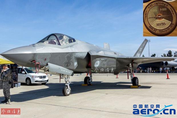 圖為首次參展的荷蘭皇家空軍(RNLAF)首架F-35A“閃電II”隱身戰機(機身編號F-001),該機最初于2012年8月交付,目前隸屬于RNLAF第323測試與評估中隊,左上小圖為該中隊的徽標。