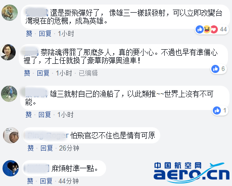 對于此項提議,臺網友興致勃勃地討論了起來。有網友認為,“照這個理論,隨扈也可能開槍,那是不是都不要配槍?”但大多數臺灣諷刺意味濃厚,稱“不無可能。±^續砍軍人的錢遲早會發生。”“不是危言聳聽,蔡英文其實并不得軍隊絕對效忠,但很可惜的是他把這個可能性說出來令某人有了防范,真的是美中不足。”“很中肯,因為雄三都會誤射。”“還是掛導彈好了,像雄三一樣誤發射,可以立即改變臺灣現在的危機,成為英雄。”