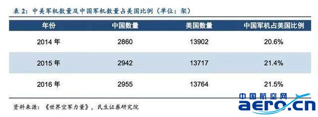 總體數量上,我國軍機數量近為美國的20%!妒澜缈哲娏α俊凤@示:2016年,美國軍機數量13764架,世界占比26%;中國軍機數量僅為2955架,世界占比5.6%。