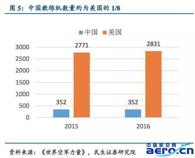 解放軍教練機的少,僅為美國教練機總量的1/8。《世界空軍力量》顯示:2016年,世界現役教練機總數為11189架,美國現役教練機數量2831架,占全世界教練機總數的25%,解放軍現役教練機數量352架,占全世界教練機總數的4%。