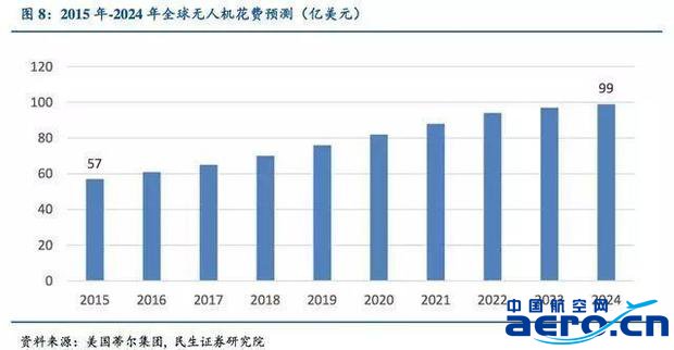 市場(chǎng)份額上看,美國(guó)占據(jù)著全球69%的份額,遙遙領(lǐng)先于占比10%的中國(guó)。其2015年軍用無(wú)人機(jī)預(yù)算達(dá)到了50億美元,占當(dāng)年軍費(fèi)預(yù)算的0.8%左右,并呈逐年遞增趨勢(shì),2018年達(dá)到69.7億美元。