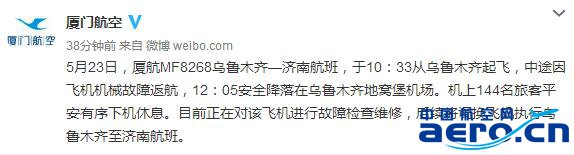 據廈門航空微博消息,5月23日,廈航MF8268烏魯木齊—濟南航班,于10:33從烏魯木齊起飛,中途因飛機機械故障返航,12:05安全降落在烏魯木齊地窩堡機場。機上144名旅客平安有序下機休息。目前正在對該飛機進行故障檢查維修,后續(xù)將調換飛機執(zhí)行烏魯木齊至濟南航班。來源:民航事客戶端
