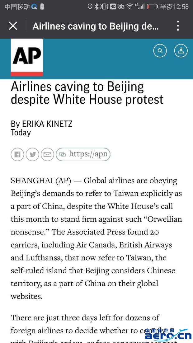 美聯社稱,距最后期限還有三天,多家外航屈從于北京,盡管白宮已抗議。