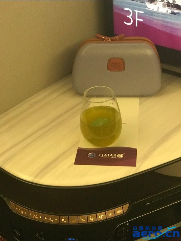 Qsuite餐前飲料與洗漱包。
