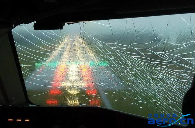 外層風擋破裂的飛機正在降落,客機的外層風擋上會涂抹防雨劑,也稱為厭水涂層,所以不能再干風擋上開啟雨刮器。