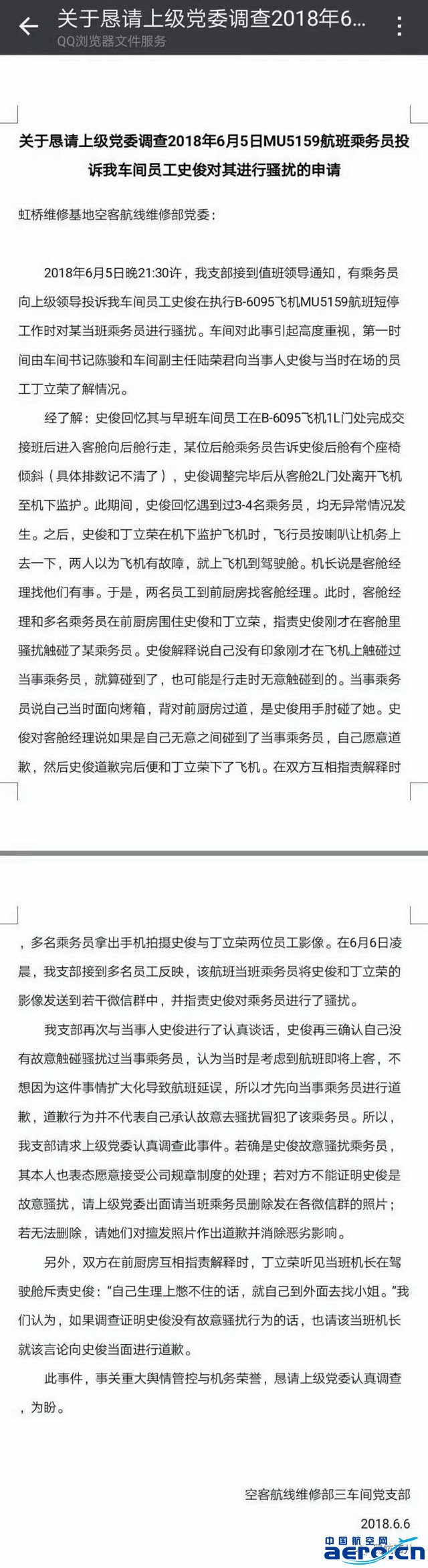 6月6日,一篇“關于懇請上級黨委調查MU5159航班乘務員投訴機務騷擾的申請”在坊間火了。沒有調查,就沒有發言權,小編先不對事件雙方孰是孰非作評論,一定要先給東航技術虹橋維修基地空客航線維修部三車間黨支部領導點個贊!在業界,我們見過太多機組與機務發生摩擦時,機務領導們擔心怕影響了機組飛行情緒狀態,總是讓機務要顧全大局,受了太多委屈的機務們心情咋就沒人關心了那?