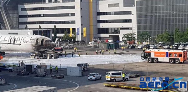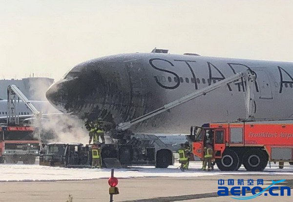 當地時間6月11日,法蘭克福機場一輛拖車牽引漢莎航空A340至航站樓時,拖車突然起火,火勢蔓延至A340駕駛艙。雖然消防員第一時間將火撲滅但客機機頭被大火灼燒受損嚴重,所幸機上并無乘客。(圖片來自:twitter)