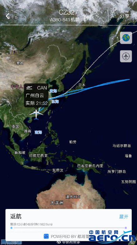 南航CZ327航班過境日本后,于今日凌晨返航廣州。 @航班管家 圖