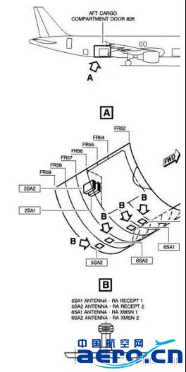 無(wú)線電高度表天線安裝在后機(jī)身的機(jī)腹部,共四個(gè)。從前到后依次是1號(hào)接收,1號(hào)發(fā)射,2號(hào)發(fā)射,2號(hào)接收。