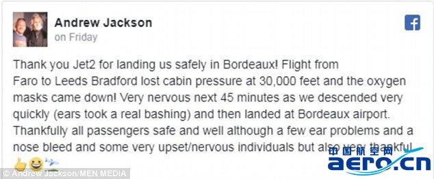 其中一名“劫后余生”名為的旅客安德魯•杰克遜(Andrew Jackson)在社交媒體表示:“謝謝Jet2讓我們安全地登陸波爾多!從法魯飛往利茲布拉德福德的航班在30000英尺客艙失壓,氧氣面罩掉了下來!接下來的45分鐘非常緊張,因為我們很快就下降了(耳朵真的受壓了)然后降落在波爾多機場。”