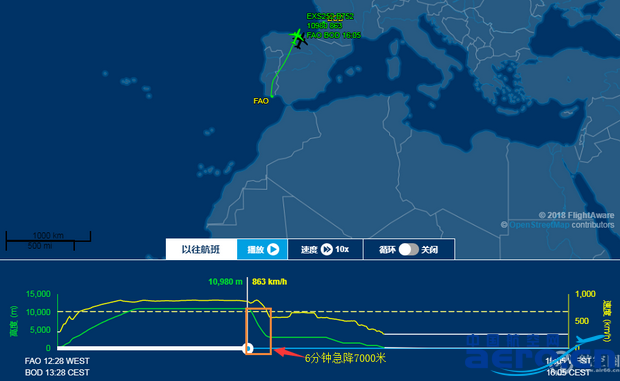 航空圈查詢航班追蹤網站數據發現,該航班事發時,僅僅6分鐘就下降7000米,從巡航高度10980米緊急降落到3060米。