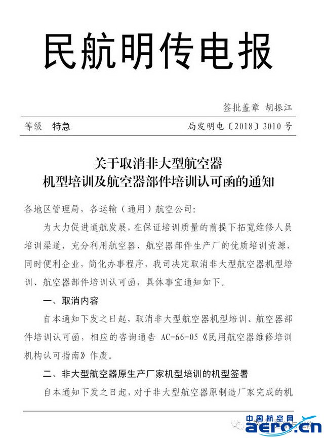 自本通知下發之日起,取消非大型航空器機型培訓、航空器部件培訓認可函,相應的咨詢通告 AC-66-05《民用航空器維修培訓機構認可指南》作廢。