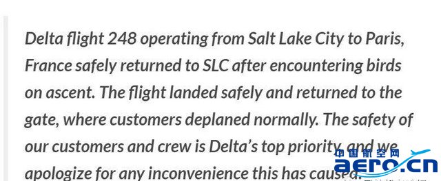 達美航空從鹽城湖至法國巴黎的248號航班在遭遇鳥擊之后安全返回鹽城湖國際機場。飛機已經安全降落,并已回到航站樓,乘客正常下機。乘客和機組的安全是達美航空的第一要務。由此引起的不便我們深感抱歉。